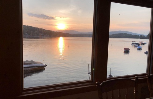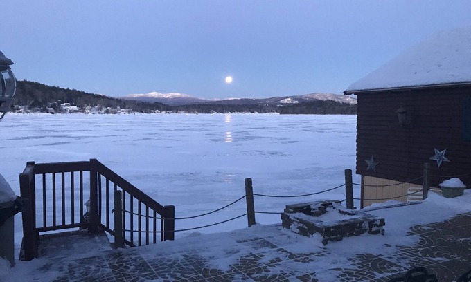 This beautiful and clean 3 bedroom, 2 loft cottage sits on the water of pristine Newfound Lake in Bristol, NH. The mountain and sunset views from all rooms are stunning. The cottage features a large eat-in kitchen with all the amenities including a dishwasher, full stove/microwave, refrigerator, toaster over and dining table and adjoins a huge family/TV room with comfortable couches, recliners, chairs and fireplace and another dining table that seats 8-10 people. The dining table sits in front of a bank of windows overlooking the lake that makes you feel like you're floating while you enjoy your meal. Two large full baths and family game room in the finished basement featuring air hockey and ping pong tables complete the inside of this large cottage. The cottage comes equipped with seven TV's and internet connection. In the summer, it also offers a dock for your boat, a perched beach for sunbathing, an anchored raft for swimming and the opportunity to rent a mooring for your water toys. A large outside patio and deck area boasts seating for a crowd and includes a year round firepit overlooking the lake. You can't get closer to the water than this!