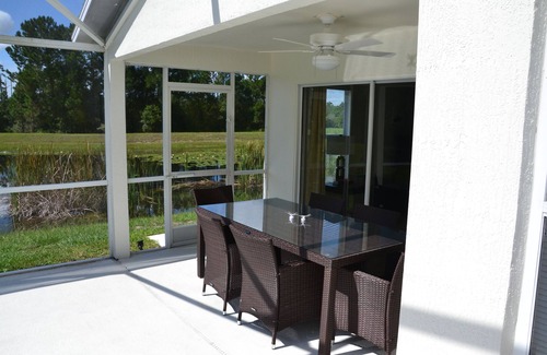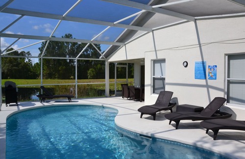Beautiful villa with king and queen master suites, two twin bedrooms and three bathrooms. The fully screened pool deck is in a position that gets continuous sunshine and is complete with sun loungers. The private pool area is overlooking woodland and the beautiful Clear Creek lake.