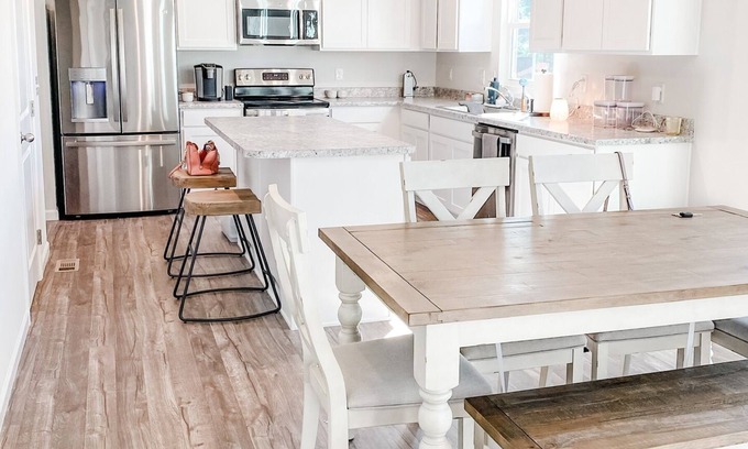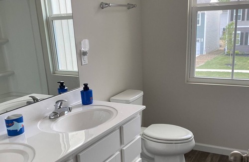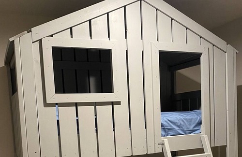 This is a new build home with a modern interior a lot of sleeping areas for a large family. Very family friendly with a crib and bunk beds. This home also has a large patio with a fire pit attached. Fully finished basement with wet bar and full size refrigerator.