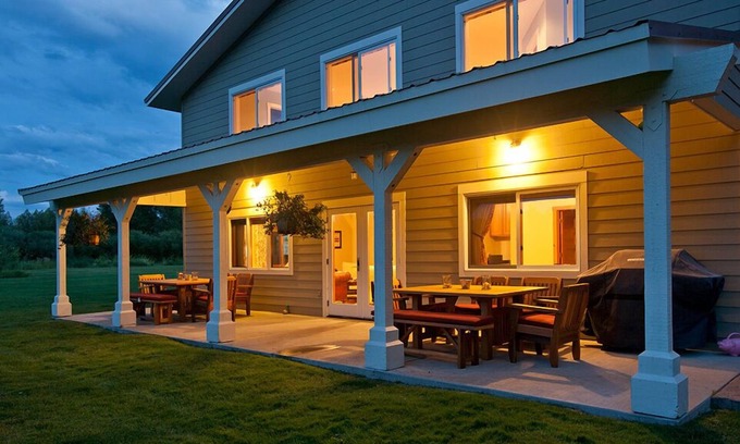 The outside area is a nature lover's dream. Large 1.8 acre on Fish Creek. There is a covered area which includes 2 dining tables and propane grill. In the summer months, a hammock is outside on the patio and fire pit and chairs are situated near the creek to dream about your adventures in the Tetons. Moose are frequent visitors to the yard, so be on the look out. It's a great place to just sit, relax and take in the breathtaking views.