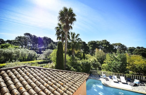 Quiet house, near the sea( 7 minutes walk), in lush greenery, not overlooked, heated pool ( from October till May)of 13m.X 5m with SPA. Beautiful landscaped garden with garage for 2 cars. Large living room, dining room, office, decoration by interior designer. 4 air-conditioned bedrooms each with its bathroom. Fully equipped kitchen, plancha outside. Partly covered terrace for lunch outdoors. Cleaning, made at departure, linens included. Electric bike available.