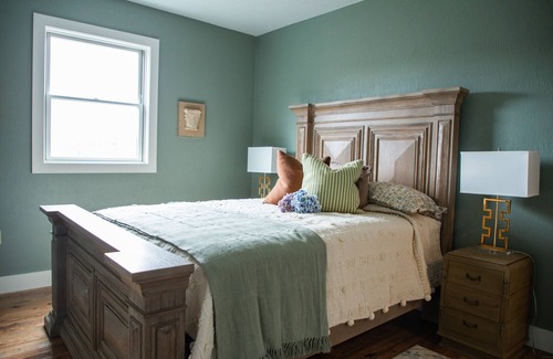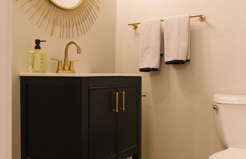 The farmhouse has three bedrooms upstairs all furnished with modern decor and cozy Anthropologie bedding. Two of the rooms have queen beds, and the third is a master with a king-sized bed and private bathroom with a jetted-tub AND shower. Plus, another full bathroom on the second floor!