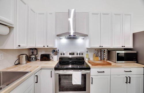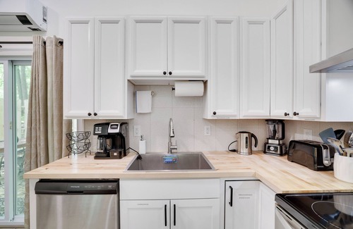 The modern kitchen is located right off of the main living areas, and is loaded with all new stainless steel appliances & a coffee station (including a Keurig)