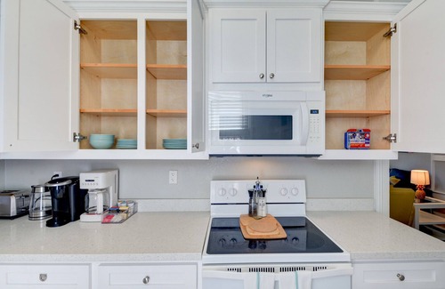 Prepare a meal or order in. This kitchen is fully equipped with glasses, mugs, plates, bowls & silverware. Coffee/Tea Bar includes drip coffee maker, Keurig, and electric kettle. Blender, toaster, and microwave included. Electric stovetop range + oven. Pots/pans, baking sheet, oil, salt & pepper.