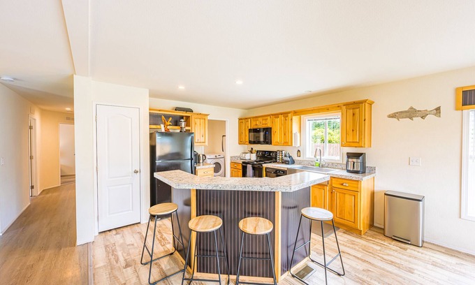 Indulge in comfort at our stylish home in Beaver, WA! Sink into the expansive sectional leather couch in the modern living space. Enjoy newer interior finishings and a fully stocked kitchen for culinary enthusiasts. Pamper yourself with bathrobes provided for the infrared sauna, and keep your gear ready with a convenient boot dryer. A laundry room is available for your convenience. Choose between kitchen bar seating or a dining table that accommodates four, creating the perfect setting for meals and relaxation.