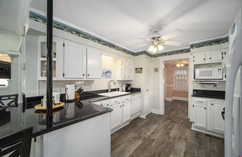 Comfortably sleeps up to six people in any combination of adults and children with one queen size bedroom, one full size bedroom, and one bedroom with a trundle bed that expands to two twin beds. The peach bedroom is off the kitchen and connects to yellow bedroom and second bathroom.