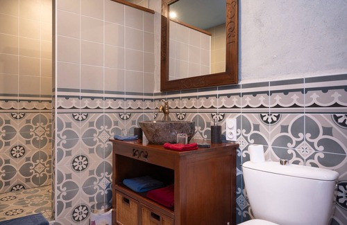 Four of the bedrooms are for 2 people, with a 160x200 bed, private shower room and WC. The fifth room is a family room for 5 people, with two separate bedrooms and two private shower rooms and toilets. One of the bedrooms is for 3 people, with a 90cm bed and a 160x200cm bed. The other is for 2 people with a 160x200 bed. A shared fully-equipped kitchen is at your disposal.