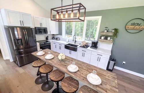 The large, gourmet style kitchen is fully stocked so that you can prepare a full meal. The main room with cathedral ceilings and numerous windows brings in plenty of natural light and offers a nice view of the property.