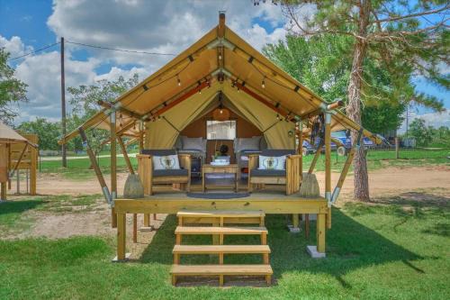Providing a garden, BeeWeaver Luxury Glamping - Idyllic Hive Check provides accommodations in Navasota. This property offers access to a terrace, free private parking, and free Wifi. On clear days, guests can head outside to enjoy the luxury tent's outdoor fireplace or simply kick back and relax. Towels and bed linen are provided in the luxury tent. Additional in-room amenities include wine or champagne. You can prepare your own food in the kitchenette before eating on the private balcony, and the luxury tent also offers a snack bar. The luxury tent has a picnic area where you can spend the day outdoors. The nearest airport is Easterwood Airport, 35 miles from the luxury tent.