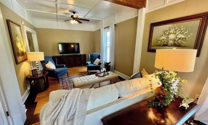 This historic home has been wonderfully renovated and furnished to create the perfect place for your whole family to gather, connect, relax and rest. With plenty of room for the entire family to get together, and also enjoy an amazing nights rest on one of 5 super comfy and stylish beds. It features a massive great room with two full sofas, two comfy sitting chairs and a 72” TV. It also has two large dining tables and a bar so everyone in the family has a seat at the table. Plus a huge yard!