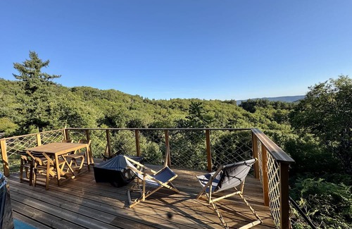 The dome can sleep up to four adults in a double bed and two single beds, each bed having it's own panoramic view of the beautiful landscape. There is storage and two comfy sofas for enjoying views of the Milky Way and stars on a clear night. The dome has it's own lockable door and is well insulated to reduce hot summer temperatures as well as keep the dome cosy and warm when it's cooler outside. Blackout curtains also keep the dome warm and private and guarantee a great nights sleep. Your own private kitchen and bathroom are a few metres from the dome, accessible by the wooden walkway. You'll have a good size terrace where you can dine up to four people, or relax on a deck chair soaking up the sun and far reaching views. The main house of Les Coumayres is a minutes walk away, should you need anything or want to join us for one of our summer film nights under the stars. You'll have access to the grounds, and children's playground, which includes trampolines, large net swing, slide and climbing frame. Your kitchen includes gas hob, everything you need for cooking and dining, AirFryer, and fridge. Explore the magical Gorge d'Heric, hike down Les Milles Marches, walk around the magical Lac de Vezoles or go canyoning and kayaking on the rover Orb, before returning to your cosy dome. There are so many things to see and do in this beautiful part of the countryside, especially for those who want to unwind in nature, away from the stress of modern life.