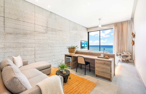 -- Suite 3 - upper-level, king bed, oceanfront, television, coffee + beverage hub, mini-fridge, sofa seating, desk + chair, walk-in closet, ensuite with double vanity, beauty counter, and rainfall shower with water wand.