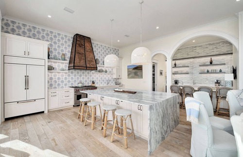 The generous primary living/dining/ kitchen area is on the second floor to take advantage of amazing Gulf views from floor to ceiling sliding doors. Everyone eats together at a large table, massive marble island, and large peninsula bar. The well-appointed kitchen, butler pantry, and bar area have two dishwashers and refrigerators, warming drawer, convection microwave, gas stove/oven, beverage cooler, and ice-makers to accommodate the most discriminating chef. After dinner enjoy a movie on our 85-inch TV/Sonos system with plenty of comfortable seating for all.
