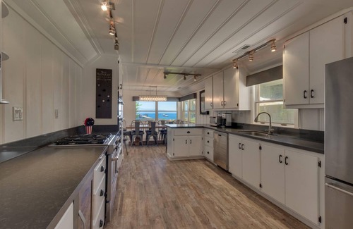 Belleview's Beauty is a charming, lakefront vacation rental in a adorable neighborhood on the popular the west shore. Outdoors, few homes can compare. The large patio is ideal for festive gatherings; the hot tub is situated for star gazing; the extensive shared pier is the envy of many; the expansive lawn nearly reaches the water's edge, ideal for tossing the football, sunbathing or simply watching the kayaks drift by. This cozy Tahoe cabin has white washed knotty pine walls, light wide-plank wood floors and luxury duvets with down comforters, creating a feeling of warmth and charm throughout. Classic furnishings and rustic tables recreate an authentic Tahoe mountain theme with a streamlined minimalist approach. The living room has large windows allowing the sun to stream in while adoring eyes look out over the wondrous, vast blue. The kitchen is well equipped for all your needs and quite spacious. All bedrooms are comfortably located upstairs. Finally, Belleview's Beauty is located just minutes from the bike path to Tahoe City where restaurants, shopping and activities abound. If you are seeking the perfect family vacation experience Belleview's Beauty is your spot!