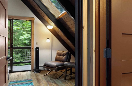 This fully remodeled A-frame sanctuary offers a spacious and comfortable stay. Upstairs, you'll find two inviting bedrooms, each equipped with air-conditioning, large skylights, and a woodsy view. The bedrooms feature plush queen beds, sitting areas, and ample natural light. A full bath upstairs is conveniently located between the bedrooms, while a second full bath is situated on the main level.