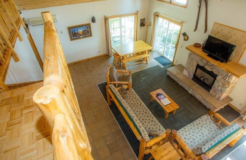 The gas fireplace anchors a comfortable living room where board games and movie nights feel right at home. A full kitchen opens to the dining area, giving you space to gather for pancake breakfasts or fish fry dinners. When summer heats up, air conditioning keeps the whole cabin cool.