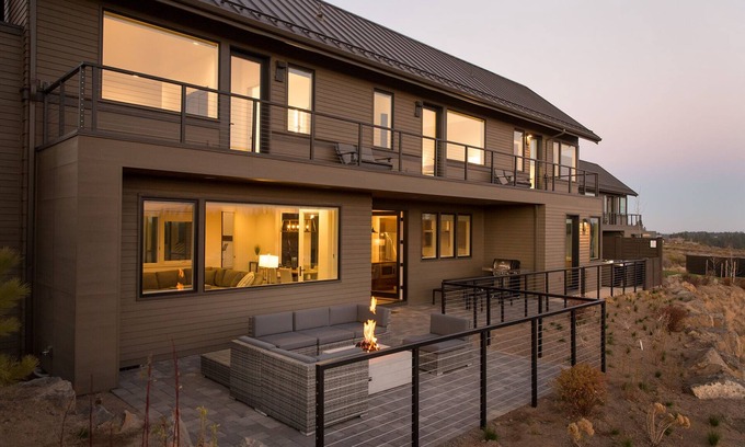 Take in the incredible views from the ample outdoor areas of this beautiful, modern home at Tetherow Resort. Enjoy cooking a meal with your group in this home's fully equipped kitchen or use the BBQ and dine al fresco in the Central Oregon sunshine at the outdoor dining table. Enjoy your morning coffee from one of the upper level decks, which can be accessed from any of the four upper level bedrooms. Other amenities for you to enjoy include the outdoor patio seating and fire pit, the home's private hot tub, fully equipped kitchen, gas fireplace, and two car garage for your skis and bikes.