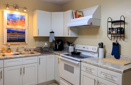 Beneath His Wings is a charming one bedroom, one bathroom basement apartment with its own entry and patio area. There is a glass storm door, so the front door can be left open to let the light shine in. There is a smart TV in the living room with Roku and a smart TV in the bedroom, a small dining area, work area and fully equipped kitchen that includes air fryer, blender, 12 cup coffee maker (filters included), electric grill, slow cooker, toaster, plenty of dishes, pots and pans, utensils, basic supplies such as oil, aluminum foil and some spices.