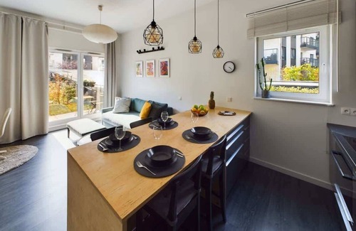 The apartment is located on the ground floor and has accommodations for four people. It is an ideal option for a family or a group traveling together. The interior is tastefully arranged, and accessories in warm colors brighten the rooms and add to the homey atmosphere. Two beds are located in a separate bedroom on a king-size double bed, and another two in the living room on a double sofa bed. A delicious meal can be prepared using the induction cooktop available in the kitchenette, as well as an electric oven with microwave function. A dishwasher is an added bonus. Enjoy a cup of coffee brewed in the capsule coffee maker on the furnished terrace belonging to the apartment. In addition, a fenced-in piece of lawn is available, which will be perfect for relaxing after a busy day. The bathroom is equipped with a walk-in shower, towels and a special set of free toiletries. A washing machine and dryer will certainly come in handy during longer stays. The apartment is suitable for those working remotely - the living room has a desk along with a chair, and a high-speed WiFi connection is available in all rooms. Additional multimedia amenities include a flat-screen TV (SmartTV+) and an Internet TV package. The place is pet-friendly.