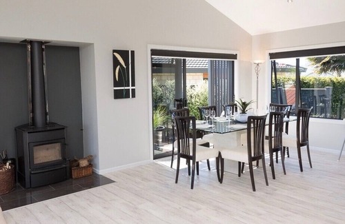 This One Tree Point holiday home includes a bright, well equipped an open plan living, dining, and kitchen space - stay toasty and relaxed indoors by the fire, or cook up a holiday feast and catch up around the breakfast bar. A second family room in the guest wing provides additional space to unwind, along with an office space for those wanting to stay connected - the guest wing situated down 3 steps with a door separating it, includes the family room, bedrooms 4 and 5, and a full bathroom. This is a practical separate area - perfect for extended family groups!