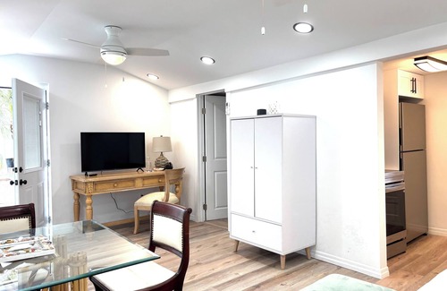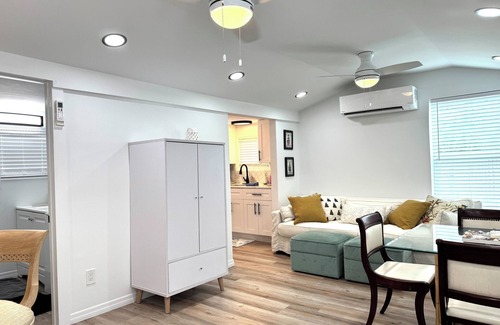 Escape to this cozy, light-filled cottage, completely rebuilt in 2025 with a brand-new kitchen featuring stainless steel appliances. Enjoy a comfy full bed in a loft-like setting, commercial-speed WiFi, 2 TVs, and in-unit laundry. The perfect serene hideaway for lovebirds seeking a peaceful retreat! Light & bright with windows scattered throughout make this an ideal work setting. Fully gated & landscaped yard with gas grill & firepit. Parking for one vehicle off a small shell road with a separate space large enough for a Suburban.