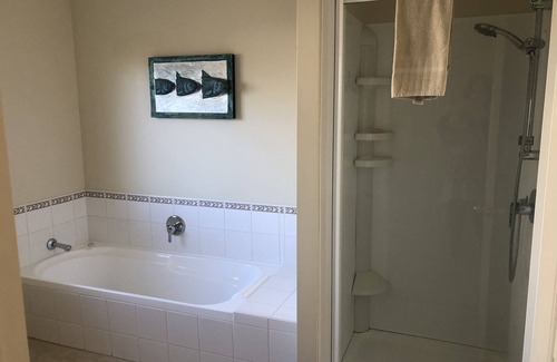 Beautiful private house, with water views from the upstairs. Private fenced back area with palms. The house is on a quiet culdesac with a walkway to the beach. The beach is about a 2 minute walk away and is an inner harbour beach.