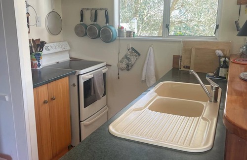 A private, characterful holiday home overlooking Waimanu lagoon and the mountains beyond. The accommodation comprises a living/dining area downstairs with kitchenette, then a twin bedroom next to the bathroom and laundry. Upstairs there is a queen bedroom and additional living area where there is a futon style sofa bed. For winter months, there is a woodburner and radiators and heaters in the bedrooms and bathroom, wood is provided. Wifi is very fast, the TV has a chromecast, the bathroom was updated in 2020 so there is plenty of hot water. The view is its best feature as you wake up to see ducks and swans gliding over the water - all in all, it's a relaxing and welcoming place to unwind and enjoy the ambience of Waikanae Beach with its scenery, walks and cafes/restaurants.