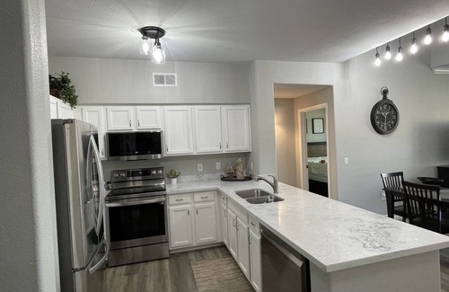 Gated resort-style living in this second floor 2bed/2bath condo with loft (twin daybed with trundle). New stainless steel appliances with a fully stocked kitchen. New high-end home furnishings, flooring, and fresh paint throughout. Spacious living room with high ceilings and abundant natural lighting; new 60 inch Smart TV, equipped with Roku stick and Hulu Plus. The Master bedroom is furnished with a King bed, 55 inch Smart TV complete with Roku stick, sound bar, DVD player and Hulu Plus. Extra sheets, towels, pillows, blankets, and pool towels are readily available. This condo boasts a private, shaded balcony that can be accessed from the living room or Master bedroom that overlooks a green space. Fully remodeled bathrooms with walk-in showers.