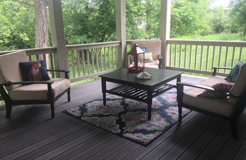 There is a beautiful large deck overlooking a wooded creek with a large gas grill and plenty of seating to entertain.