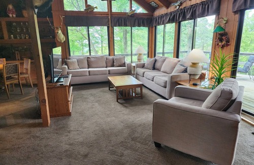 Very large luxury home/mini ski lodge. Located at the very top of the slopes. Just 300 feet from the double triple chair lift. Recently refurbished, Perfect for multi families, large groups, weddings and golf outings, Two large decks, 2 Bars, disco with dance floor, lighting and sound system. 10 large screen TV's, pool table, dart board. Located at the very top of the ski slope. Ski in and Ski out. Large ski room with inside and outside ski racks. 3 Fire Places. 4 living room areas ands 4 dining room areas. Steam room, sauna room. Stainless large BBQ grill, fire pit. Seating for 65 people. will, Can park over 20 cars on two private paved parking lots. Beam ceiling with antiques from around the world. Beautiful view. Over 80 windows.Includes bedding, towells, paper products, trash bags, pots/pans, coffee maker, toaster, k cup, new appliances, washer dryer dinnerware for 24. Make your next vacation something really special. Absolutely the best luxury party house and location. Nothing else compairs. 5 star reviews on all travel sites.