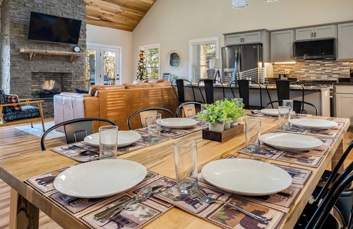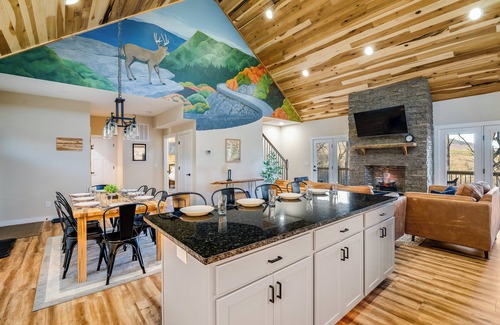 Poplar Skies, a new custom-built retreat located in Massanutten. Breathtaking mountain views and only minutes away from ski & hiking adventures. Locally sourced poplar wood gives it a rustic & cozy charm. Unwind in the covered hot tub or gather around a fire table for cozy evenings with friends or family. Inside, entertainment abounds with a pool table and classic arcade games. A striking one-of-a-kind mural uniquely celebrates the region's beauty. Poplar Skies offers an unforgettable escape.