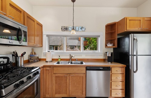 We take pride in anticipating what our guests will need, and enjoy while staying at our homes. Have a good night's sleep in one of the 2 upstairs bedrooms in your queen bed with premier linens and comforters, extra blankets, & down pillows. Then begin your day with a cup of coffee (Keurig) & breakfast in the fully-appointed sunny kitchen - your dining table seats 6. All new appliances & washer/dryer add to your home-away-from-home experience.There is also a comfy queen-size sofa bed in the main floor living room. Bring along your favorite music - you'll find a Bose docking station to enjoy.