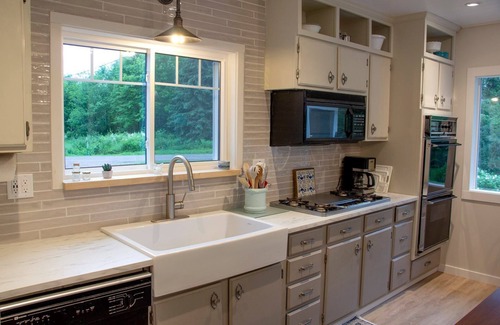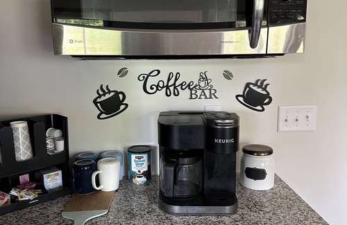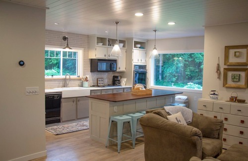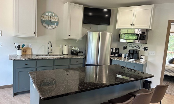 Fully stocked kitchen on the main level includes a blender, crockpot, griddle, and plenty of prep space for cooking delicious meals together