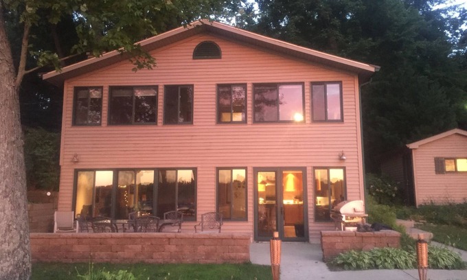 Beautiful lakefront home situated in the mid-section of Long Lake offering panoramic views including morning sunrises from the right and colorful sunsets to the left. Brick fireplace, open floorplan in the living / dining / kitchen area, and a wall of windows overlooking the lake. Landscaped yard, concrete driveway with plenty of parking, copper fire pit on the patio and an open fire pit down by the water (firewood included).