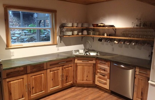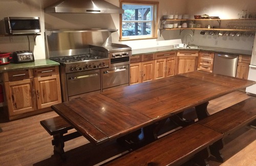 - The KITCHEN is fully equipped. Seating and prep areas are plentiful. There is a huge commercial oven (6 large cast-iron burners, 2 ovens that hold commercial-full-sized cooking trays and a large stainless-steel griddle for mass production of pancakes and eggs!) A chef’s dream, especially when cooking for groups!