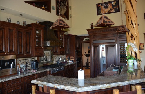 The gourmet kitchen is adjoining to the dining room and living room/great room with a 80" flat screen TV.