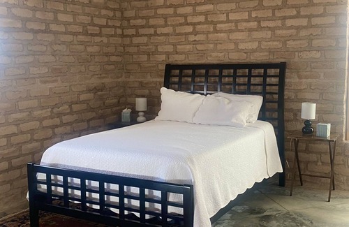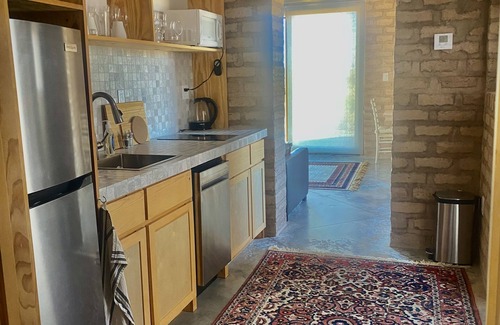 CASITA at Marfa View has a Master bedroom with a queen bed, a twin trundle and a private bath with a large walk-in shower. It also has a Kitchen and a Laundry. The Casita Living Room has a queen sleeper sofa separate full bath with a tub/shower and