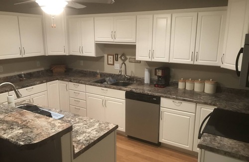 Above the garage you will find a spacious three bedroom/ two bath home that sleeps14. This is an open concept home with a full kitchen and updated cabinets and appliances. Just outside the kitchen you will find the dining area and living space.