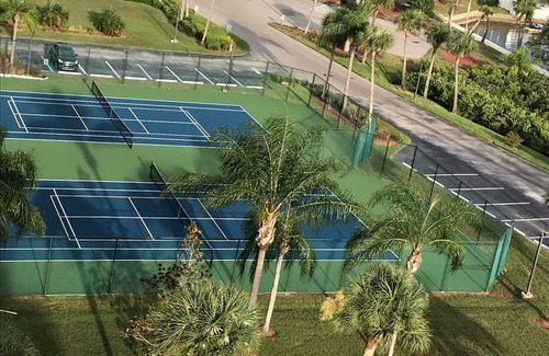 Watch the amazing sunsets right from your private balcony, the community Sunset Park or from our incredible olympic size heated and cooled saltwater pool! Dolphins, Manatees, Ospreys, Eagles are regular residents and visitors. Walk the Nature Trail, lounge on the lagoon private beach, play pickleball and tennis! Excellent fishing from the sea wall and Nature Trail Bridge. 50 acres of lovely grounds to explore for those morning and evening walks.