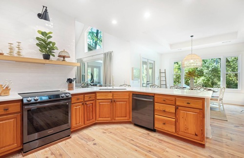 • Super stylish, 5 BR/4 BA home. (3 Kings/1 Queen/ 2 Twins) Main level master bedroom with beautiful en suite bath. Additional main level bedrooms include 2 Kings and 1 Queen. The second level bedroom/bonus space features twin "boat beds" and includes an en suite bath.