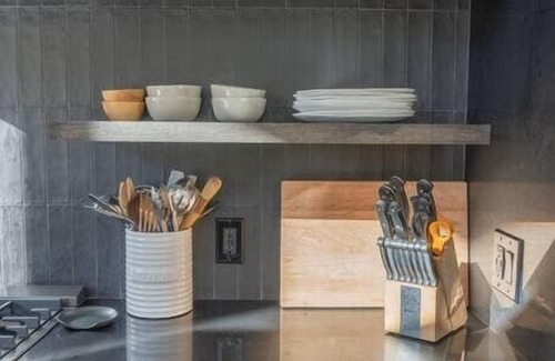 Outside, you'll discover another back terrace, a fire pit area, and a lit path through the dense woodlands that leads to a stream-adjacent yoga platform, where you can reconnect with nature and yourself.
