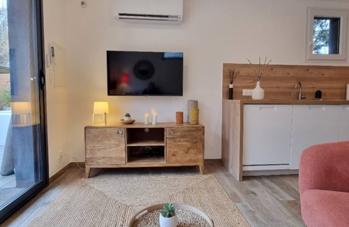 Casa Negra is a contemporary house, fully air-conditioned, bright, intimate and very comfortable. It has a 2.20 m x 4.30 m swimming pool, a 55 m² terrace equipped with a motorised awning, an outdoor lounge, a dining area, barbecue, sun loungers and parasol. It is 11 km from the centre of Aix-en-Provence and 16 km from Marseille. It is in a rather quiet residential area in the countryside, surrounded by other villas and gardens. You will need a vehicle to get around. It is perfect for couples, solo travellers and business travellers, but is not suitable for children. The house is very well equipped and air-conditioned. It has one bedroom with a queen-size bed (160 x 200 cm), air conditioning and a dressing room. Bed linen, towels and tea towels are provided. The bed is made up and the house cleaned. The kitchen has a Nespresso capsule coffee machine, conventional oven, microwave, induction hob, dishwasher and washing machine, a fridge-freezer.