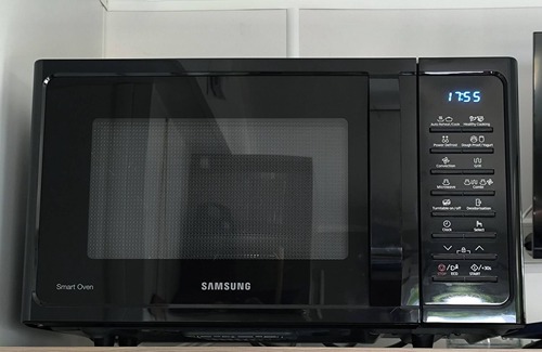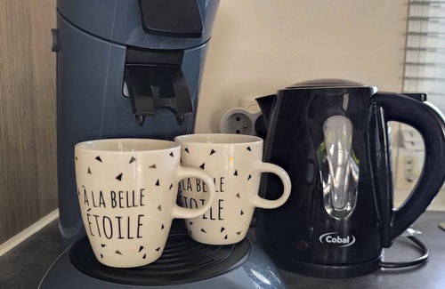 The kitchenette is equipped with a stovetop and a refrigerator, as well as a coffee maker, an electric kettle, and a microwave. And because there's access to laundry facilities, you can go a bit lighter on your packing. Other amenities include heating and a dining table.