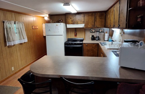 Cabin #2 is a full sized mobile home with 3 bedrooms and 1 1/2 baths. The bedrooms contain a full, queen and king bed. It has a complete kitchen with a full sized refrigerator/freezer, gas stove/oven, coffee maker, microwave, toaster, blender, dishes, glasses, coffee mugs, wine glasses, utensils and counter with 4 bar chairs.