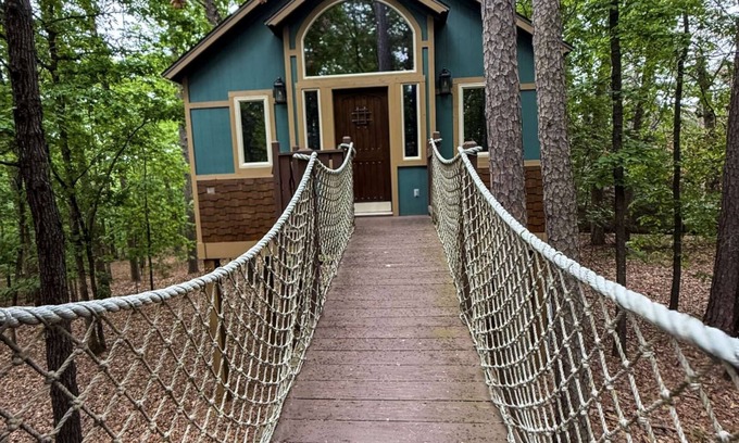Escape to the treetops at Grand Treehouses, where modern luxury meets nature’s embrace. Featuring elevated walkways and exquisite design details, including stained-glass windows, hardwood floors, gas fireplaces, and chandeliers. Unwind with premium amenities: a wet bar, 50" flat-screen TVs, free Wi-Fi, a plush King bed with luxury linens, cotton towels, a Jacuzzi tub for two, a glass walk-in shower, heated towel racks, a hair dryer, heated towel racks, and heat and air.
