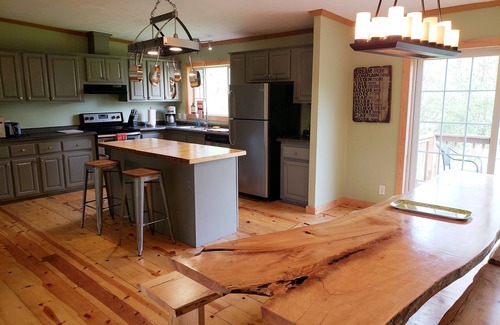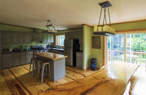 The open living room flows into the kitchen and dining room, perfect for entertaining guests and socializing. The living room has a nice sectional sofa and a TV with DVD. The Kitchen/dining area has a 14 foot Farm Table.