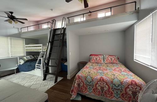 Second Floor Bedroom: 1 queen, 1 bunk bed (twin over full), 1 trundle bed, 1 sleeping cot (twin), 2 sleeping cots (twin) in the top loft, TV w/ DVD & individual AC/Heat controls.