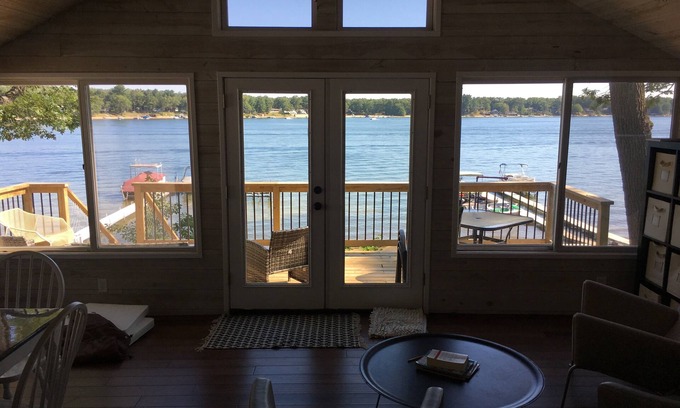Main Floor: TV lounge w/ 55" flat screen with streaming services connected. Living/Dining/Kitchen open floor plan expansive views of the lake atop a small bluff. Enjoy family meals at the large dining table or break out the board games in the evening. (DW, Stove, Microwave, Fridge, charcoal & gas grill)