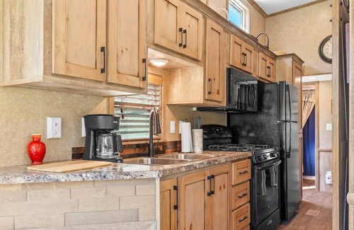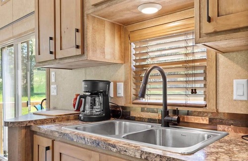 Guests will enter through the front door of the tiny home by using a digital keypad. Left of the entryway is the bathroom with a shower/tub combination. Straight from the front door is the first bedroom with a queen bed. From there, go right to get to the fully-equipped kitchen. To the left of the kitchen is the second bedroom with a queen bed and the staircase to both lofts. Each loft has a full bed. If you continue through the kitchen, you enter the living room. Here you will find a sofa bed, a reclining chair, a small dining table, and a TV.