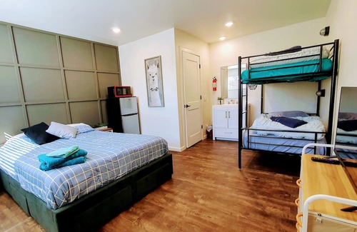 The room has a separate entrance, 1 Queen bed, and a bunk bed, great for 2 adults and 2 kids (under 18), a private bathroom, and is equipped with a fridge, microwave, TV, and more!